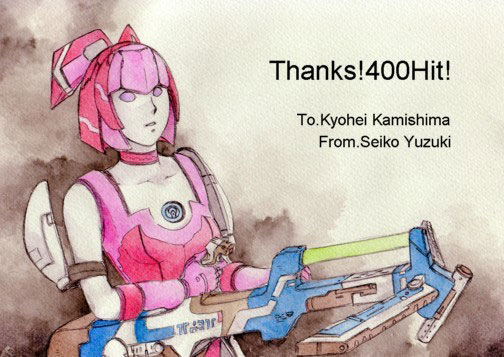 カウンター400番をGETしてくださった神島恭兵さんのリクエスト。 SEGAのネットワークRPGファンタシースターオンラインから、ピンクのレイキャシールです。 レイキャシールと言うのは、銃器類を専門に扱う女性型アンドロイドのことです。 ゲーム本編のクエストに登場のエルノアもピンクのレイキャシールと言うことで、そっちでもOKとのことでしたが、お礼のイラストなので、やっぱりご本人の使用キャラ、キョーメイちゃんにしました。胸のIDもブルーにしましたよ! しかし、アンドロイドって・・自分の画力のレベルが如実に現れて、自虐的な気分になれますよね!いや、知ってたましたけどね!自分の画力くらい!完成までに何度描き直したか(泣) でも、すごく勉強になりました。はー、こう言うキャラがすらすらっと描けるようになりたいものです。 |