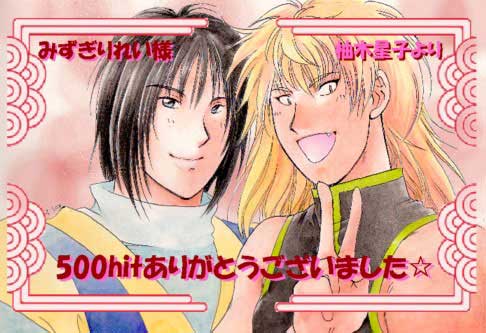 カウンター500番をGETしてくださったみずぎりれいさんのリクエスト。 グループSNE作、メディアワークス発行、電撃ゲーム文庫のTRPG央華封神で使ってたオリジナルキャラです。 左が水靖佑(すい・せいゆう)。霊魂なんかに関係する召鬼(しょうき)の術を使う道士です。石像だったのですが、色々あって人間の姿をとれるようになりました。けど、元々生き物でないので、無口でおとなしい性格です。 右は水圭太(すい・けいた)。木火土金水の五行のうち水行の仙術を使います。地面の下から水を噴き上げさせたり、汚れた水を浄化したり。こっちは蛇が変化したもので、好物はカエル(笑)。 とりあえずふたりは義兄弟なのですが(靖佑が兄)、実は二人だけをカラーで描くのは初めてです。すごく新鮮でした(笑)。意外と靖佑が嬉しそうな表情になったので、描いてるほうが驚いてしまいました。 なんだかんだ言って、兄弟仲は良いみたいです。 |