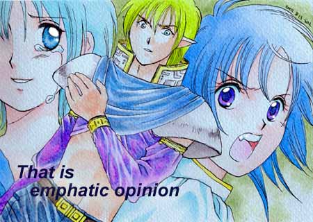 私がプレイしたのは、パソコンではなくメガCDのほうでした。シリーズが全部入ってるバージョンです。だから、1章、2章、3章とあまり区別してはいないのですが、しいて言うならばイラストは3章でしょうか。エンディング、ピクトの決断・・の場面です。 ARCS。今でも大好きなゲームです。 アルカサス、それは竜と精霊の住む地。 義父の使命を果たすために旅をするホビット族の少年、チノップ(左)。 女王の勅命を受け故郷の森を出た、エルフ族の近衛兵、スー・ニー(右)。 ふたりを仲間に(他にもいますが)、世界を守るべく戦うのは、精霊魔法を操る語り部、ハーフエルフの青年、ピクト(中央)。 闇に世界を渡さないために、戦うことが出来ますか? 大切な人を失っても、目を開けることが出来ますか? 誰かが膝をついても、俯いても、怯まずに進むことが出来ますか? 優しさをくれたチノップ。勇気をくれたスー。 全てを抱いてピクトは歩いて行きます。 前に、向かって。 |